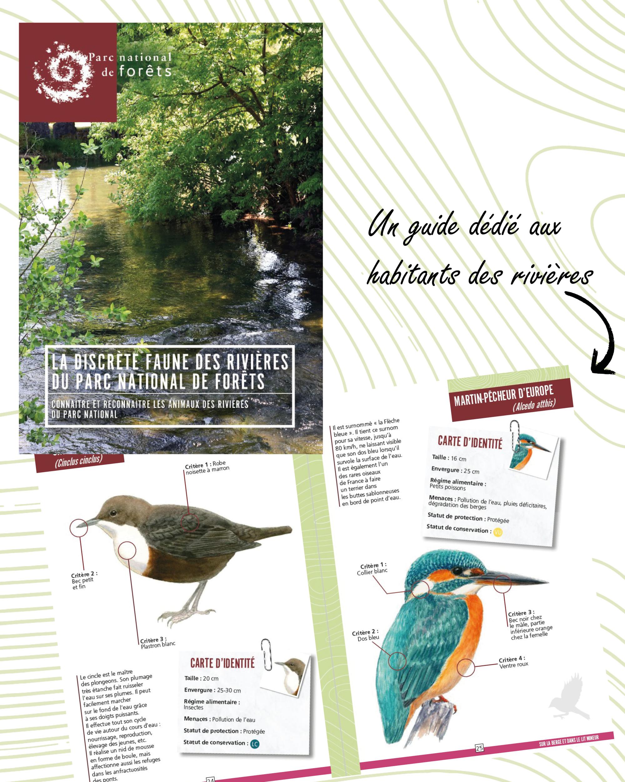 "La discrète faune des rivières du Parc national de forêts" vous proposera de découvrir le peuple des rivières. Avec ses près de 1239 km de cours d'eau, le territoire du Parc national accueil tout un cortège d'espèces animales qui vivent sous l'eau ou au bord des rivières. Ce guide vous proposera de partir à la rencontre de 21 d'entre elles !