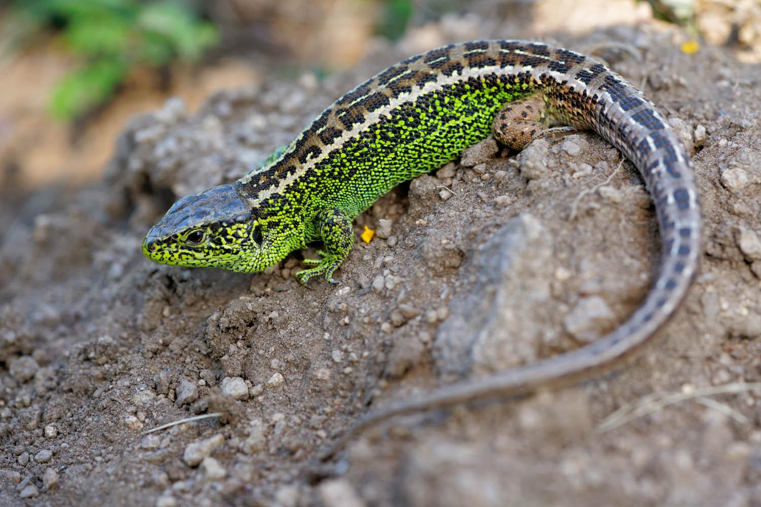 - Le Lézard des souches est un lézard plutôt lent, adapté aux climats contrastés continentaux et aux milieux plus frais que le Lézard vert occidental. Il apprécie les zones à végétation herbacée assez haute. Il habite les milieux secs comme les rocailles, les talus ensoleillés, les broussailles, mais aussi les prairies sèches, les haies et lisières de forêts. Le Lézard des souches se nourrit de divers insectes et d’araignées, qu’il capture le jour. La dégradation des habitats (déprise rurale, enrésinement, gestions inadaptées, urbanisation, piétinement des sites de reproduction etc.) constitue la principale menace pour le Lézard des souches.