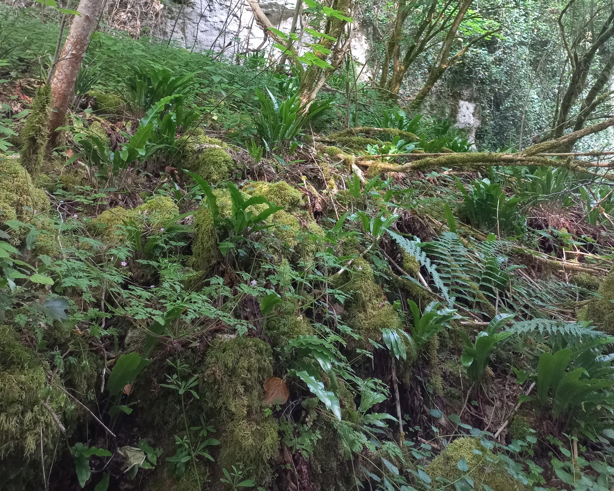 Les forêts de ravins sont des milieux boisés installés sur des pentes abruptes, généralement en fond de vallon ou le long de versants frais et ombragés. Grâce à la topographie encaissée, ces zones conservent une humidité élevée, une fraîcheur constante et sont souvent peu exposées au soleil. Ces conditions particulières favorisent le développement d’une végétation luxuriante, riche en mousses, fougères et arbres feuillus comme le Tilleul à grandes feuilles (Tilia platyphyllos), le Frêne commun (Fraxinus excelsior) ou l’Érable sycomore (Acer pseudoplatanus).